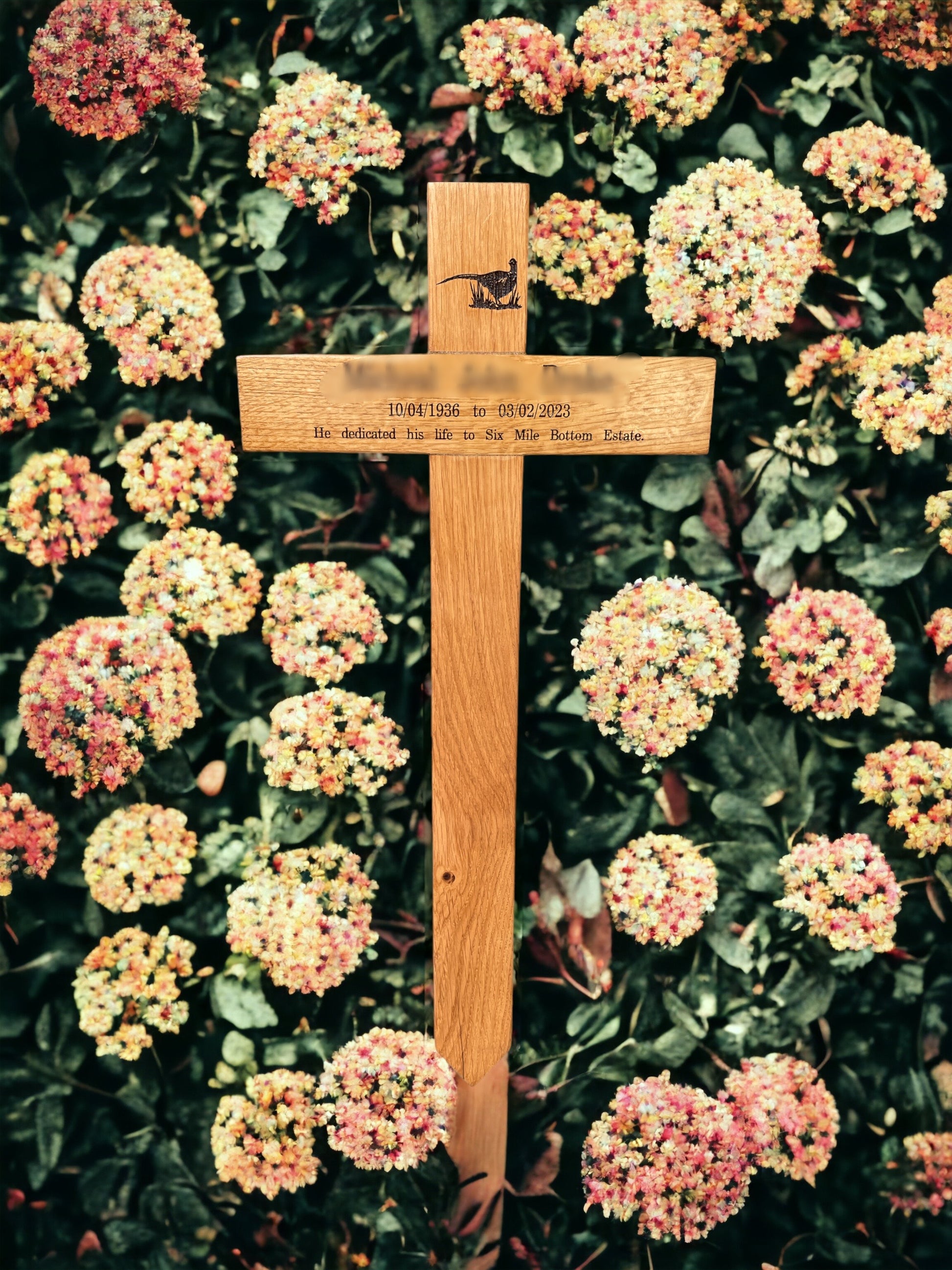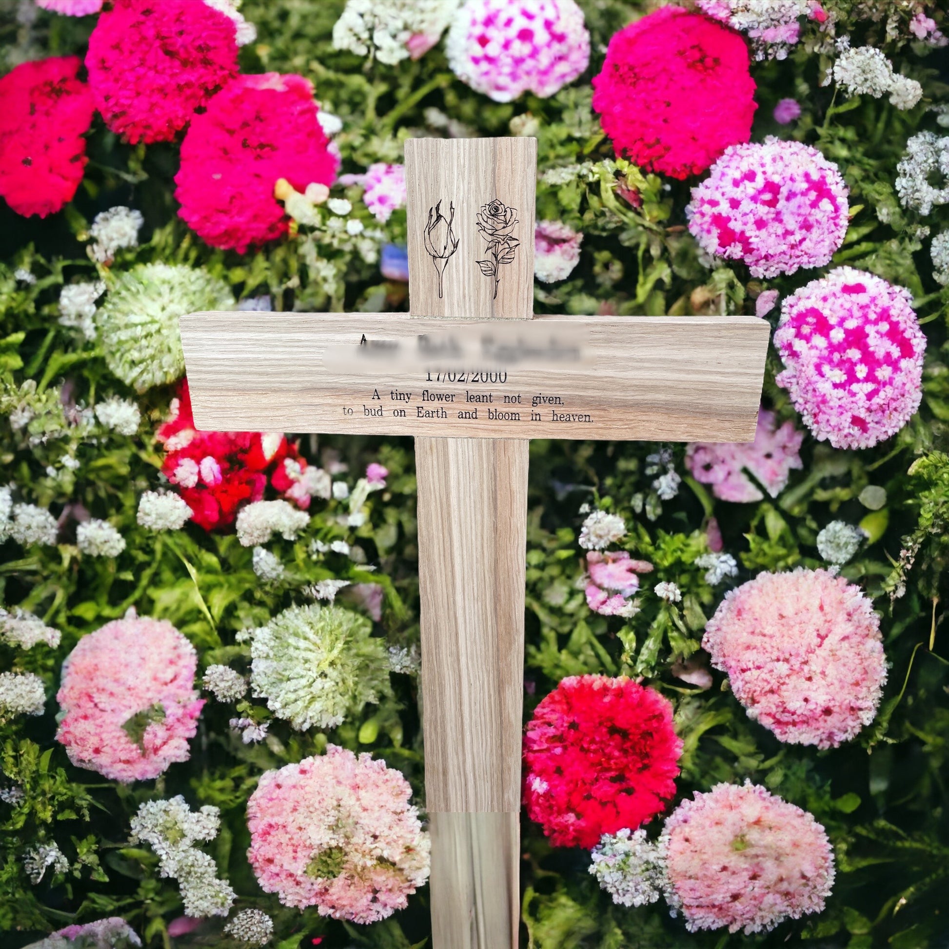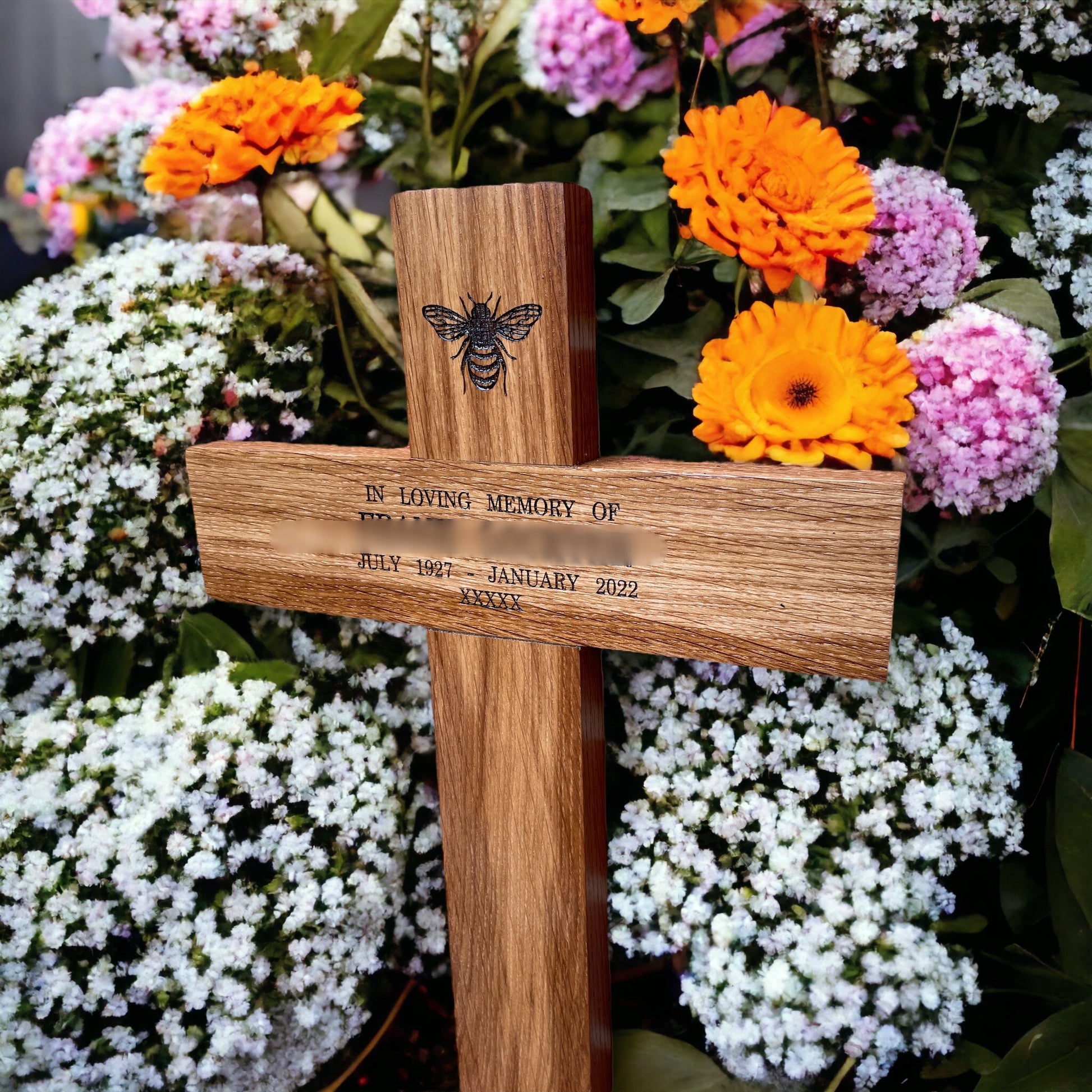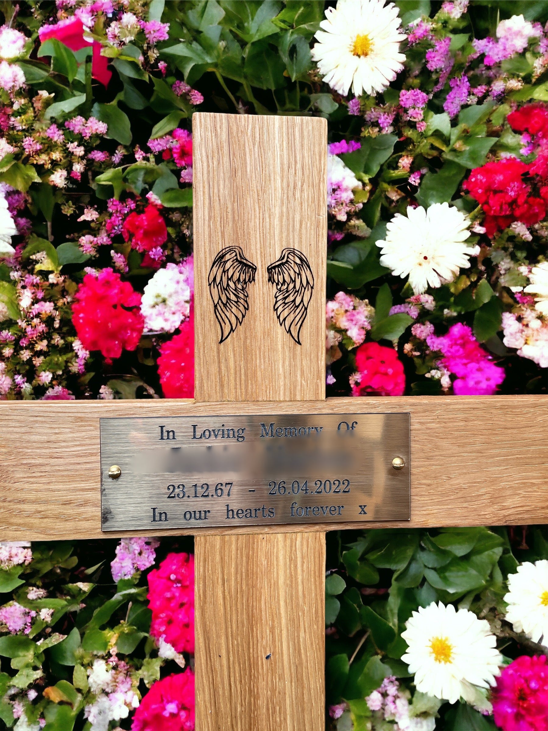 Choose from a selection of premium wood options, including Oak, Iroko, Mahogany, or Beech, each offering its own distinctive beauty and characteristics. Personalise your memorial cross further by selecting your preferred design and engraving, whether on a plaque or directly into the wood, ensuring a truly bespoke memorial.