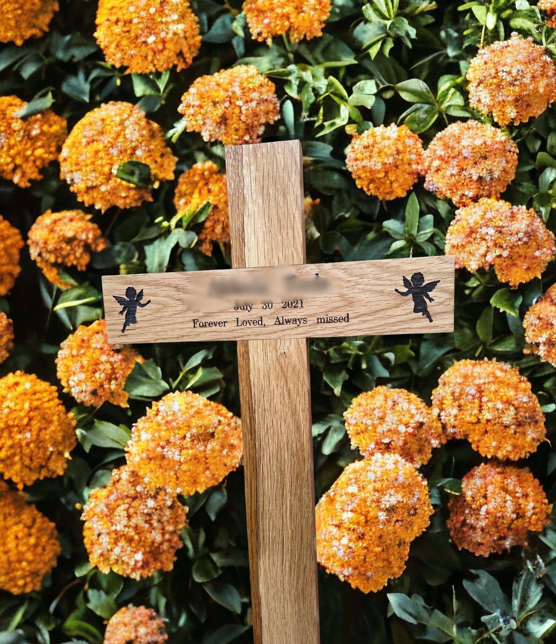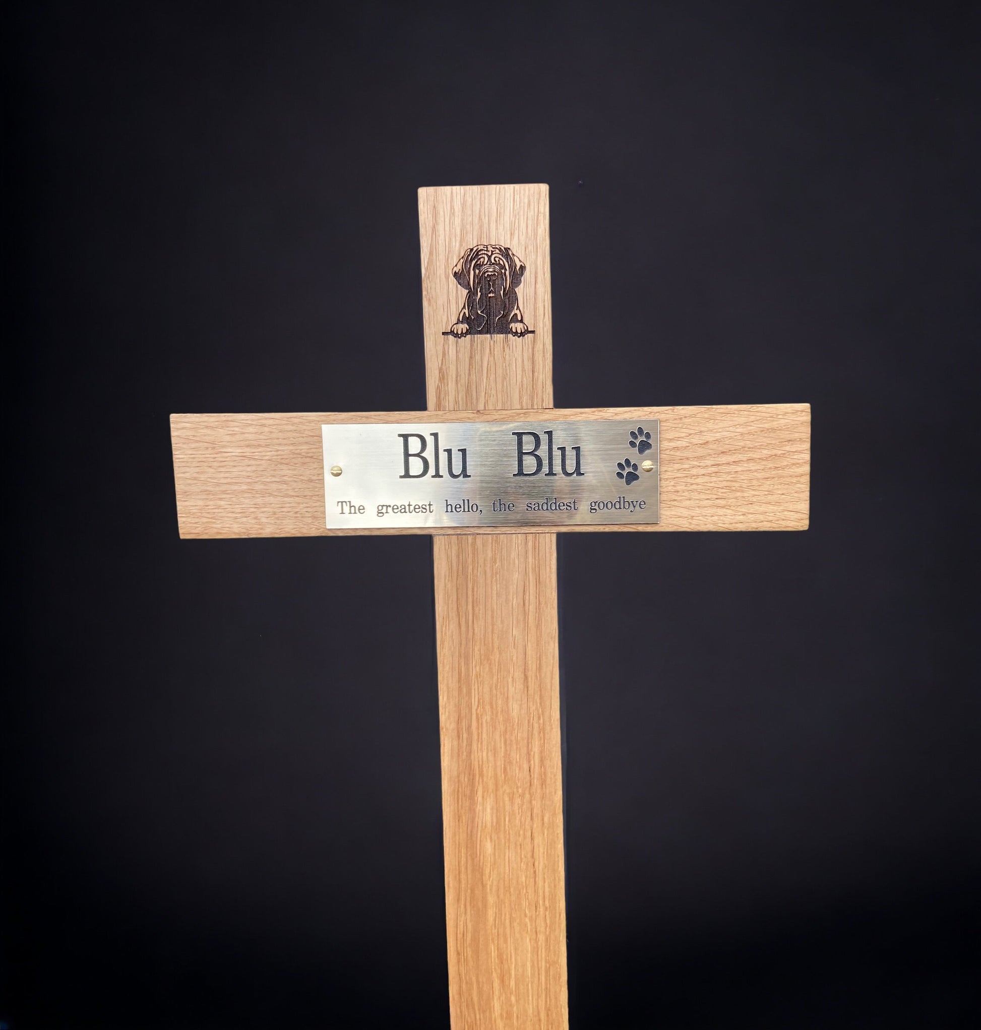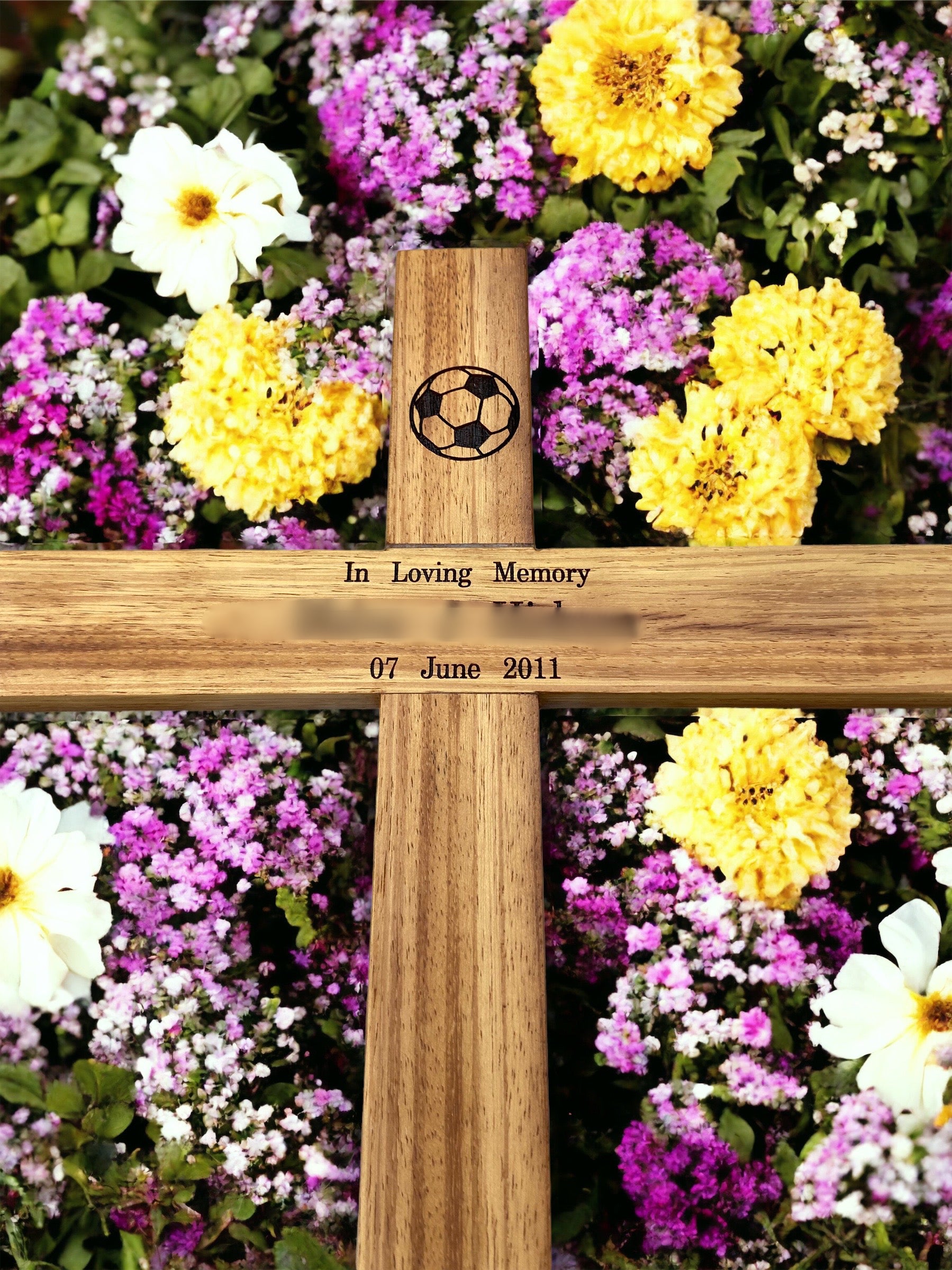 Choose from a selection of premium wood options, including Oak, Iroko, Mahogany, or Beech, each offering its own distinctive beauty and characteristics. Personalise your memorial cross further by selecting your preferred design and engraving, whether on a plaque or directly into the wood, ensuring a truly bespoke memorial.