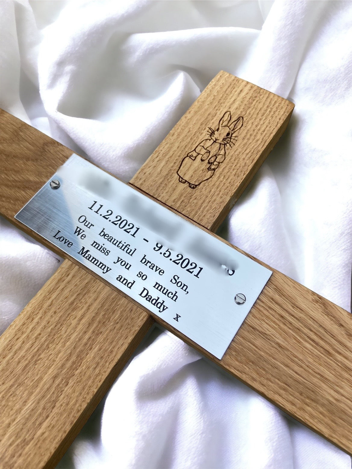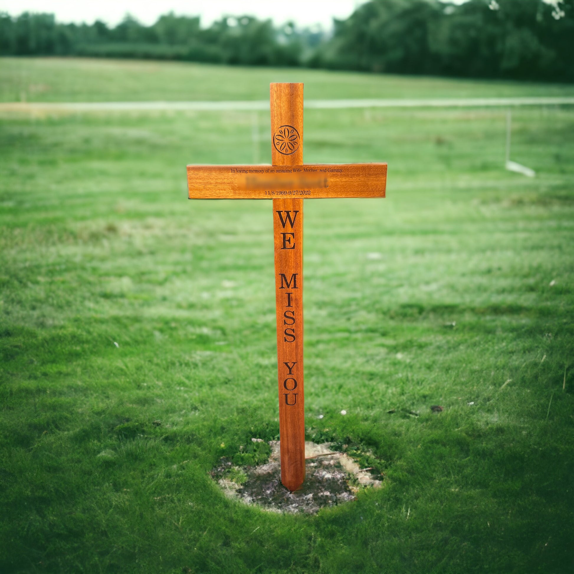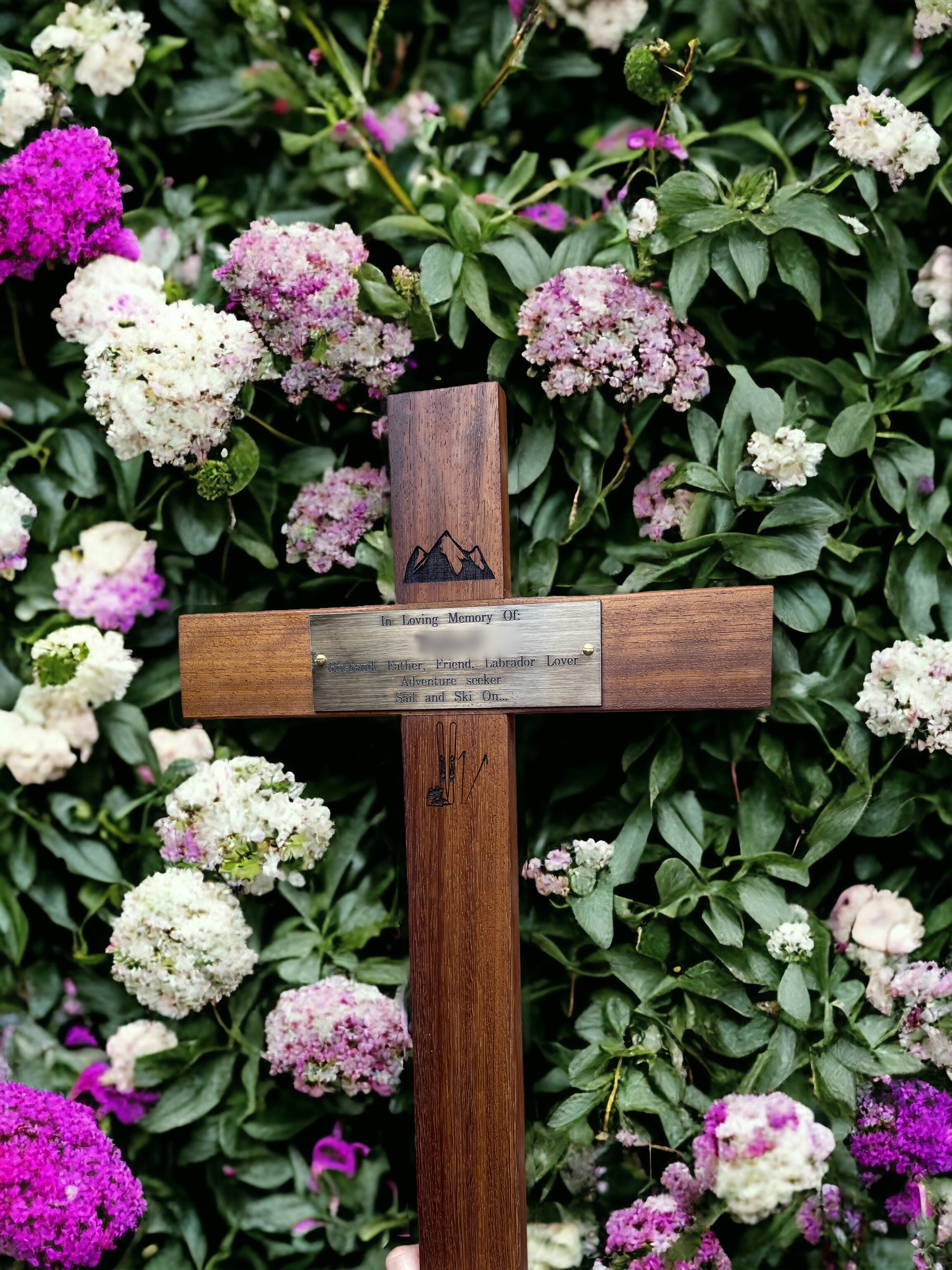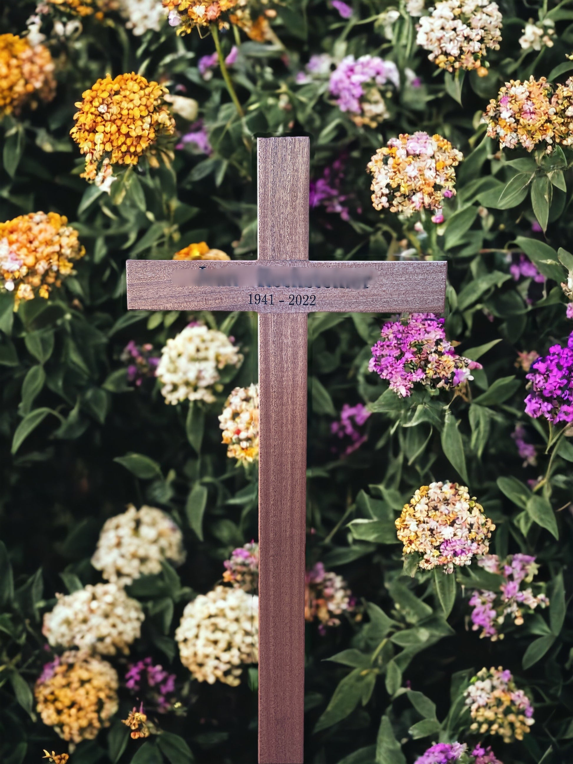 Choose from a selection of premium wood options, including Oak, Iroko, Mahogany, or Beech, each offering its own distinctive beauty and characteristics. Personalise your memorial cross further by selecting your preferred design and engraving, whether on a plaque or directly into the wood, ensuring a truly bespoke memorial.