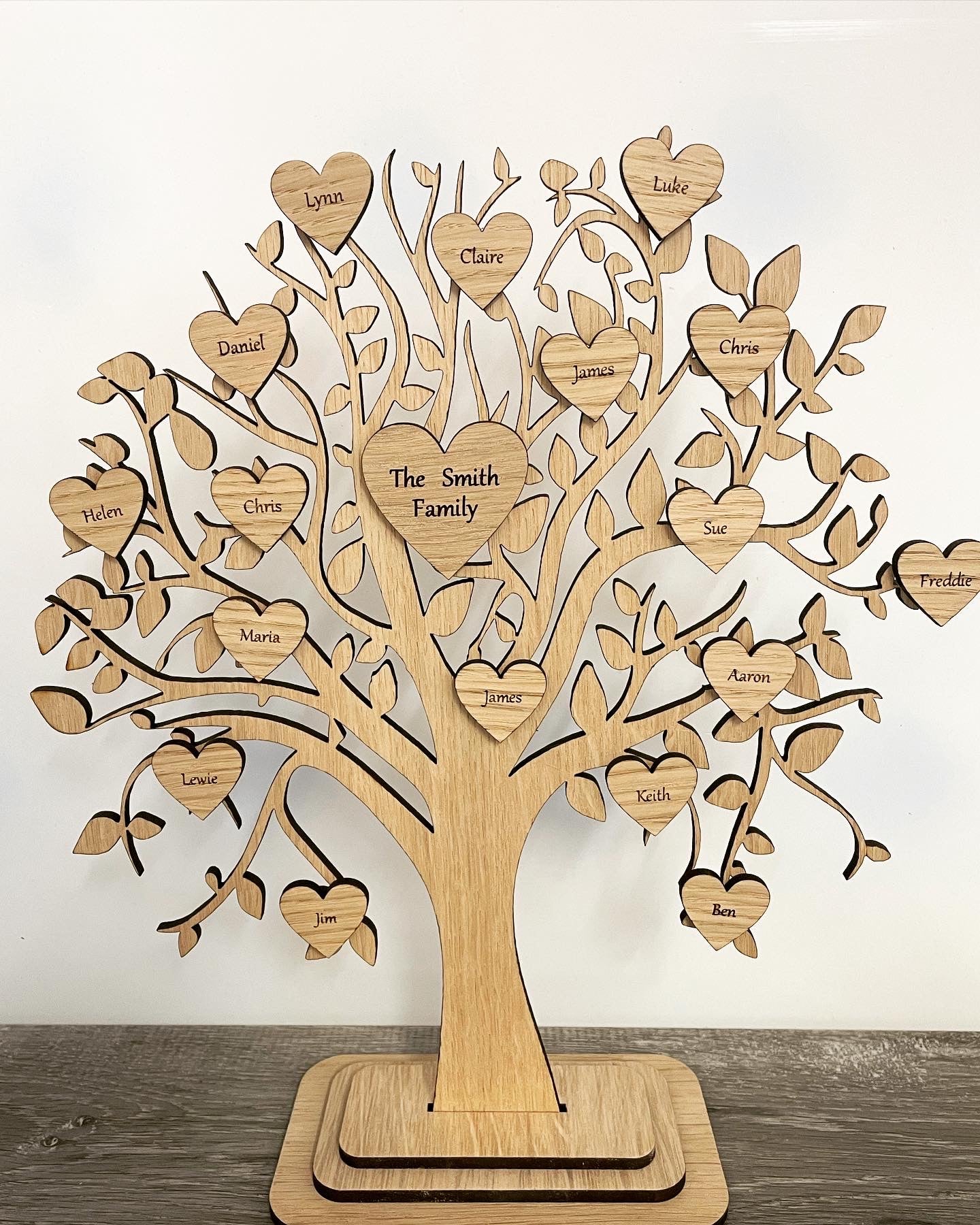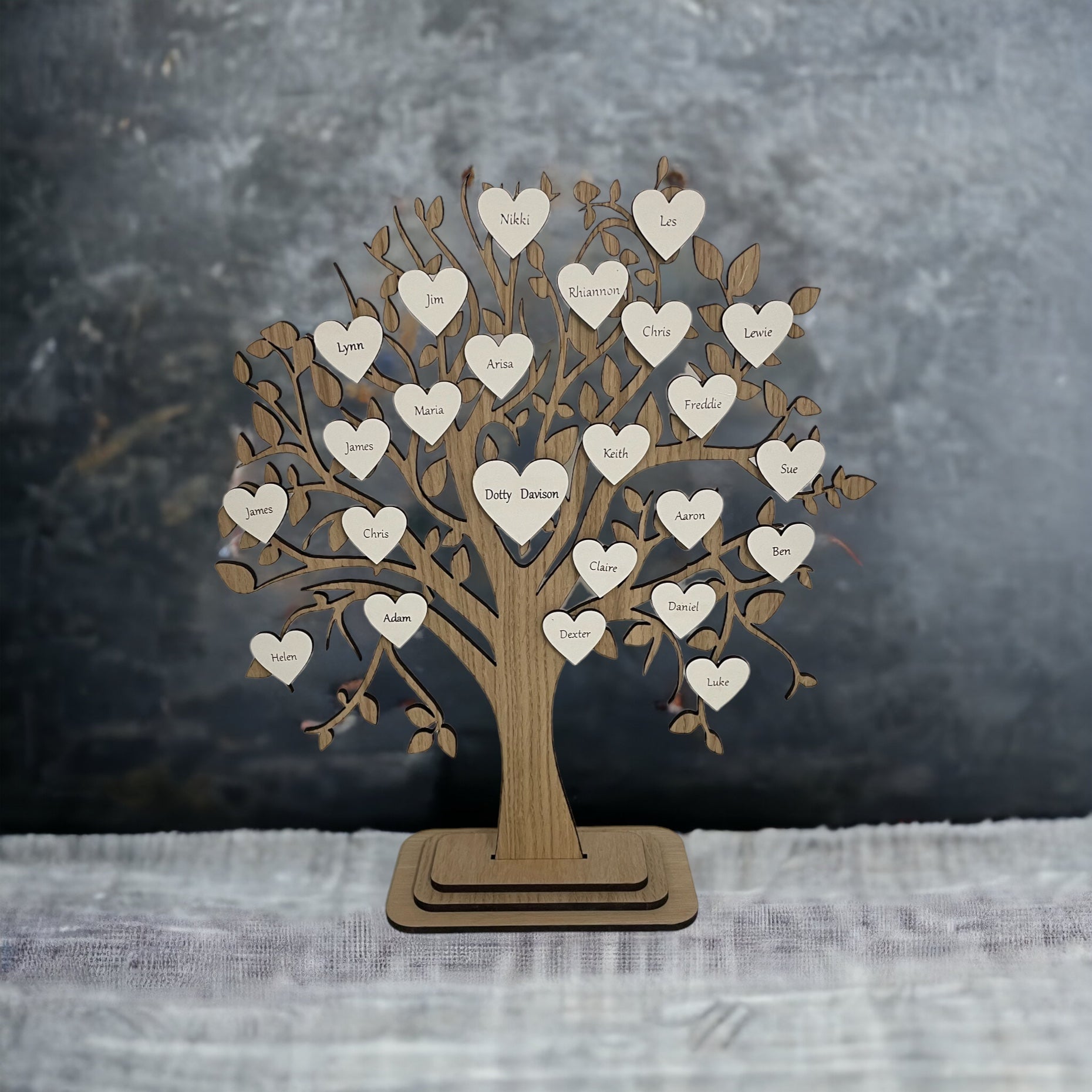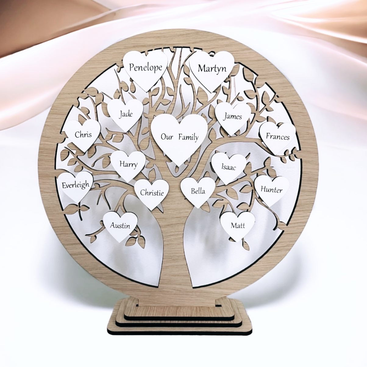 Crafted from premium Oak veneer wood, our family tree features delicate engraved hearts, pawprints, animal shapes, and angel wing hearts, symbolizing the deep love and connections within your family circle. Whether celebrating the love for your human family members or commemorating the memory of beloved pets, our personalised family tree is a touching tribute.