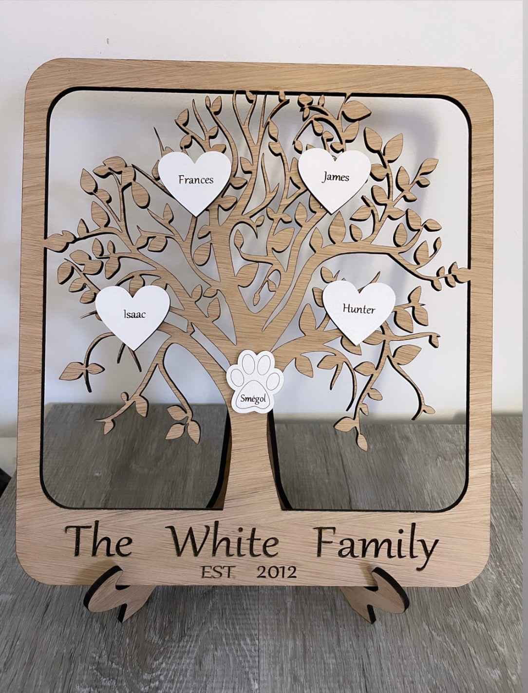 Introducing our exquisite Personalised Family Tree Gift, meticulously crafted to honour your cherished family bonds and furry companions. Each piece is made to order with meticulous attention to detail, ensuring it becomes a cherished keepsake for generations to come.