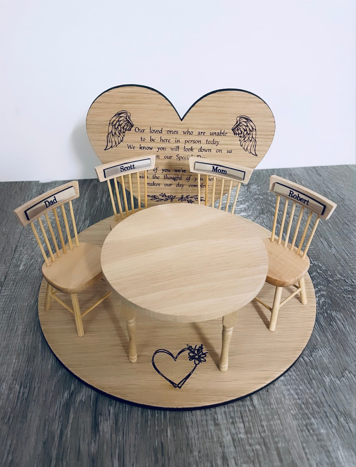 Sets include : Base, Heart poem, the amount of chairs and tables selected in that set. Names plaques for each seat/ pet bed or furniture.