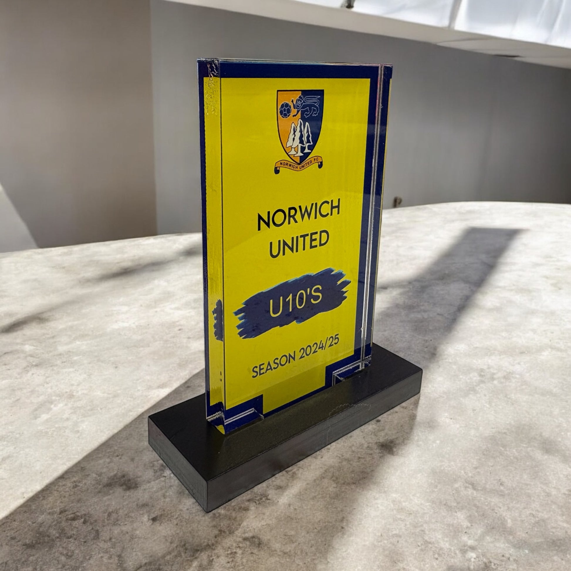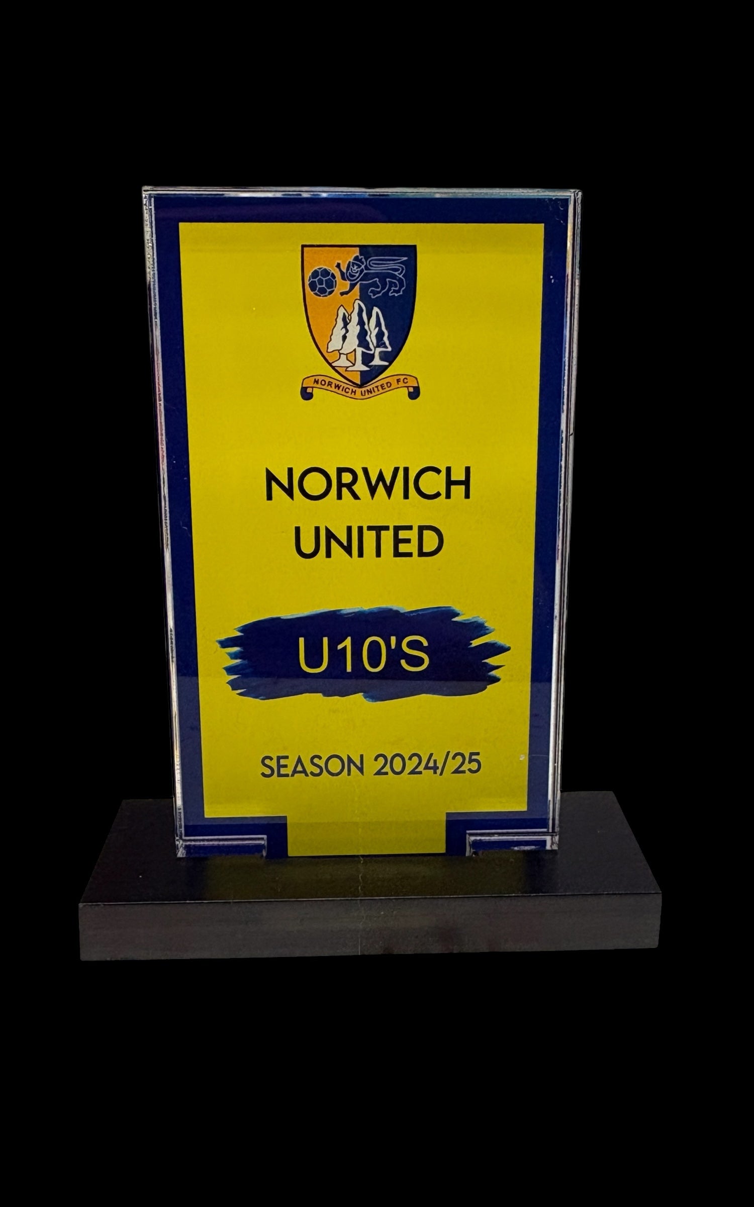 Trophies are printed on the reverse, allowing a high gloss front. All come in a black base unless otherwise requested.