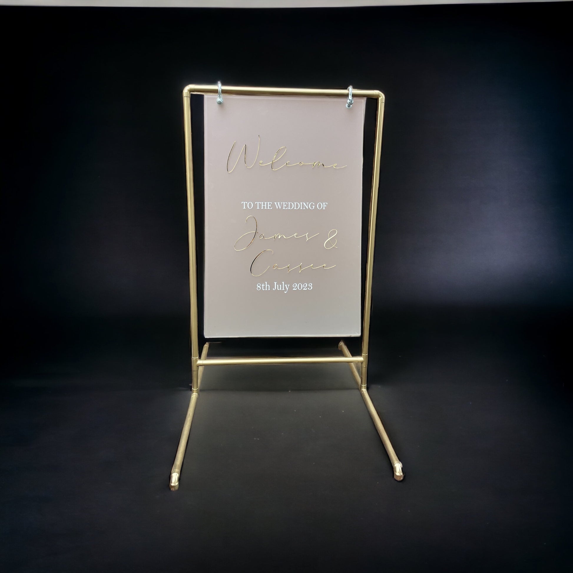 The image shows the sign with Gold mirror lettering, and printed white text.